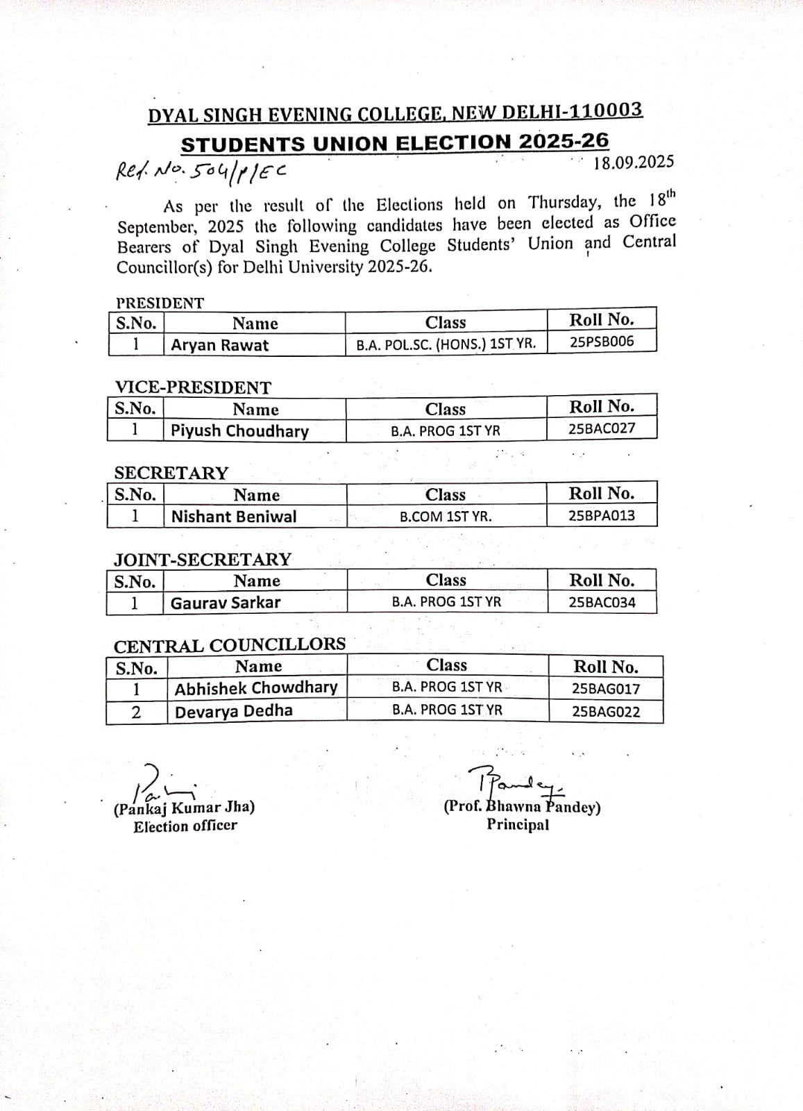 Results for Election held for Student Union 2025-26